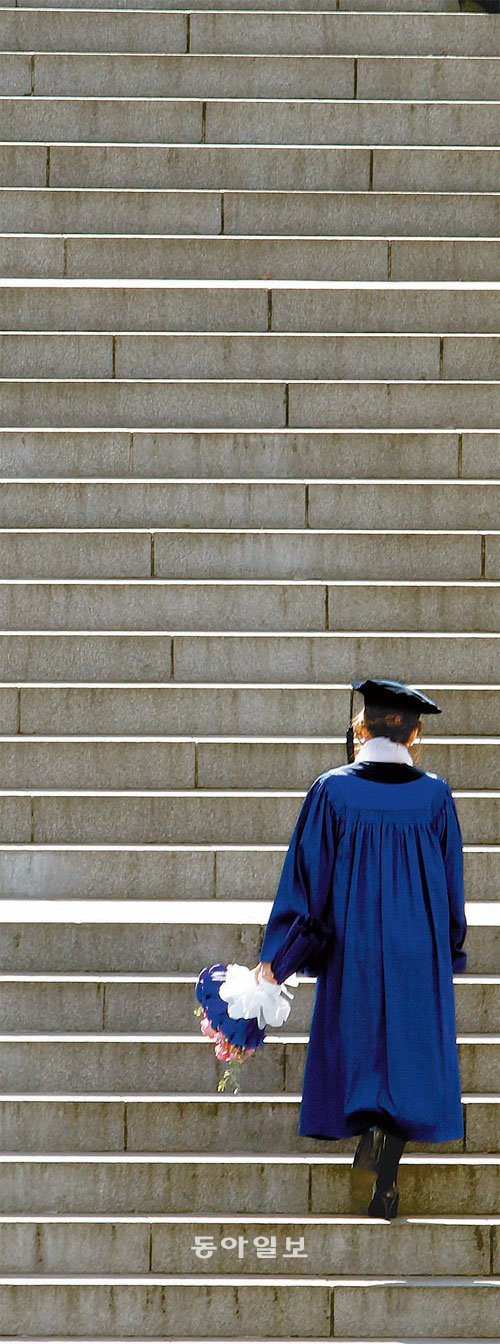 심각한 청년실업 속에 대학문을 나서는 졸업생의 어깨가 무겁다. 17일 서울 용산구 청파동 숙명여대에서 2011학년도 학위수여식을 마친 졸업생이 홀로 오르는 계단이 높아만 보인다. 이제 사회 초년병으로 첫발을 내디뎠지만 대학 졸업생에게는 아직 올라야 할 인생의 계단이 많다.