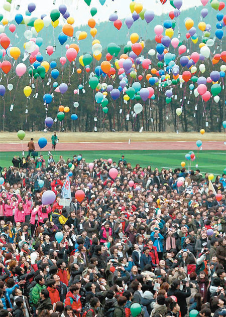 22일 오전 10시 신라대 대운동장에서는 신입생 2430명이 참석한 가운데 2012학년도 입학식이 열렸다. 식전행사와 본행사, 식후행사로 진행된 입학식에서 신입생 전원과 보직자, 교수 등이 각자의 소원을 적은 리본을 단 천연소재의 소원풍선을 날리고 있다.