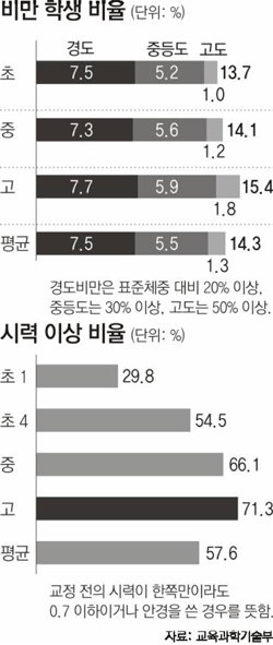 교육과학기술부가 전국 초중고교생 18만여 명을 조사해 26일 발표한 ‘2011년 학교건강검사 표본조사 결과’에 따르면 초중고교생 100명 중 14명이 비만으로 나타났다. 교과부는 2001년부터 매년 상반기에 초중고교생의 체격과 건강을 검사해 변화 추이를 발표하고 있다.