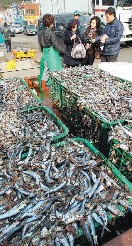 4일 부산 기장군 대변항을 찾은 관광객들이 갓 잡은 멸치를 구입하고 있다.