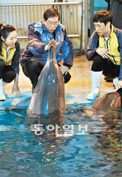 “자연으로 돌아가라” 박원순 서울시장(가운데)이 12일 경기 과천시 서울대공원을 찾아 불법 포획된 돌고래를 살펴보고 있다. 박 시장은 불법 포획된 뒤 돌고래쇼에 동원되는 돌고래 일부를 자연으로 돌려보내겠다고 발표한 뒤 이날 서울대공원을 찾았다. 서울시 제공