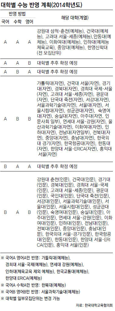 대교협 조사 자료에 따르면 상위권 대학들은 모두 두 과목을 B형으로 정해 사실상 계열별 반영 유형이 같았다. 서울대 고려대 연세대를 비롯한 상위권 대학 대부분은 △인문계는 국어B, 수학A, 영어B △자연계는 국어A, 수학B, 영어B를 반영하기로 했다.