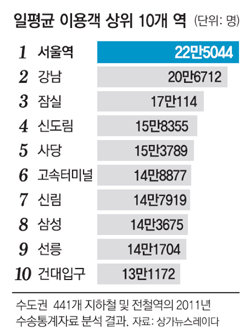 19일 상권분석 전문업체 ‘상가뉴스레이다’에 따르면 지난해 수도권에 위치한 441개 지하철 및 전철역의 수송통계자료를 분석한 결과, 서울역의 하루 평균 이용객은 22만5044명으로 전년(19만4959명)보다 3만 명 넘게 늘어나 증가폭이 가장 컸다. 2009년부터 부분 개통한 경의선 복선전철과 2010년 말 개통한 인천공항철도 이용자가 급증하고 있는 점이 주요 원인으로 분석됐다.