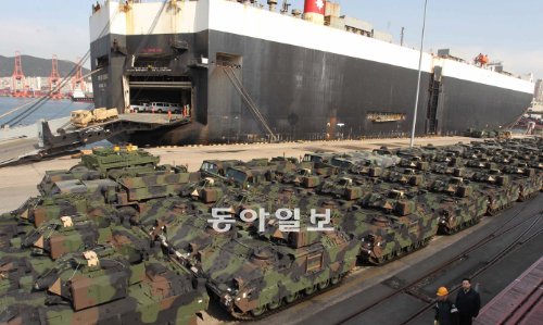 20일 오전 부산 제8부두에서 한미 연합군사연습인 독수리훈련에 투입할 장갑차와 지원 장비를 하역하고 있다. 장갑차와 지원 장비는 미군 제25보병사단 스트라이커 여단 21보병연대 김러츠 소속 1대대의 실사격 훈련에 참여할 예정이다.