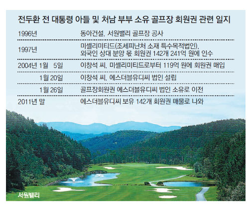 전두환 전 대통령의 아들과 처남이 소유하고 있던 시가 355억 원 상당의 골프장 회원권 142개가 한꺼번에 매물로 나와 그 배경을 놓고 의문이 확산되고 있다. 23일 경기 파주시의 서원밸리골프클럽에 따르면 지난해 말 유한회사 ‘에스더블유디씨’가 보유하고 있던 골프장 회원권 142개가 매물로 나왔다. 에스더블유디씨는 전 전 대통령의 차남 재용 씨(48)와 처남 이창석 씨(61)가 소유한 회사다.