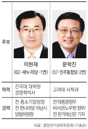 이곳에서 3선에 도전하는 새누리당 진영 의원(61)과 야권 단일후보인 민주통합당 조순용 후보(60)가 맞붙는다. 각종 여론조사에서 두 후보는 오차범위 내에서 치열한 접전을 벌이고 있다.