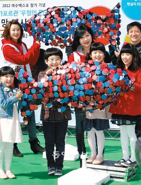 1일 서울 중구 태평로 서울광장에서 여수엑스포 싱가포르관이 ‘한국민과 함께하는 우정의 물고기 희망 메시지 이벤트’를 열었다. 참가 어린이들이 바다의 소중함과 환경보호 메시지를 담은 배지로 만든 물고기 모형을 선보이고 있다.