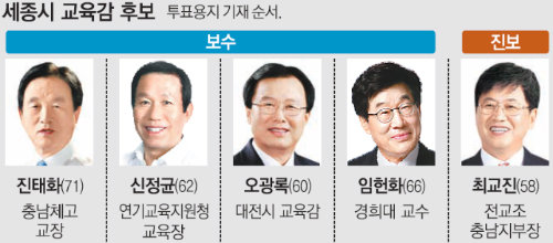 세종시교육감 후보는 2일 현재 5명이다. 투표용지 기재 순서를 기준으로 진태화 전 충남체고 교장, 신정균 전 연기교육지원청 교육장, 오광록 전 대전시교육감, 임헌화 경희대 교수, 최교진 전 전국교직원노동조합 충남지부장이 뛰고 있다. 이 가운데 최 후보는 진보 진영 후보로, 나머지는 보수 진영 후보로 분류된다.