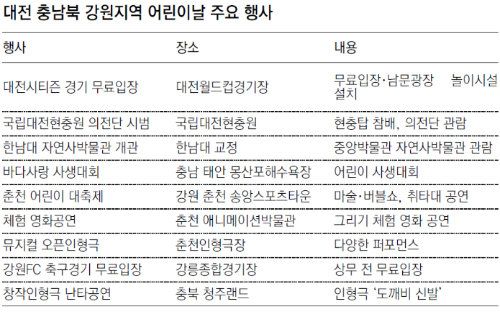 이날만큼은 어린이들이 주인공이다. 대전엑스포과학공원에서는 중부권 최고의 어린이 놀이공간답게 5∼6일 이틀간 문화·체험·특별행사가 마련돼 있다. 과학공원 전 지역에서 어린이합창단과 어린이난타공연, 어린이손인형극을 비롯해 케이팝 댄스공연, 마칭밴드 퍼레이드, 마술공연 등이 이어진다. 체험행사로는 열기구 행사, 풍선 헬리콥터, 잠망경 만들기 등 15가지 행사가 준비돼 있다.