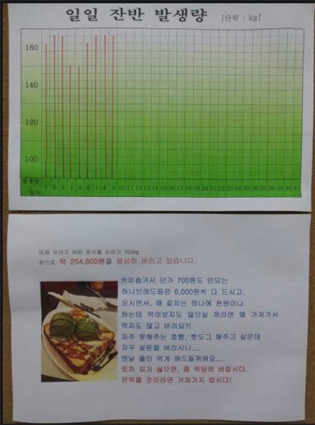 사진 속에는 한 영양사 게시판에 붙인 일일 잔반 발생량 그래프와 잔반을 남기지 말 것을 요청하는 주의글이 담겨있다.