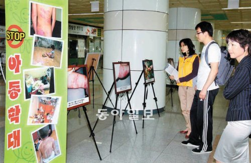 아동학대방지를 위한 캠페인 및 사진전이 10일 부산 부산진구 전포동 전포지하철역 구내에서 열리고 있다.14일까지 열리는 행사에서 관람객들이 학대받은 어린이들의 사진을 둘러보고 있다.