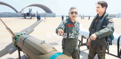 한미 공군 연합훈련인 맥스선더 훈련의 하나로 15일 광주 공군 제1전투비행단에서 한국공군의 최신예 F-15K 전투기들이 미공군과 가상공중전과 조종사 구조생환훈련을 펼쳤다. 훈련의 전투지휘 비행을 마친 한국공군의 박신규 공군작전사령관(왼쪽)과 주아스 미7공군사령관이 한국공군의 전투기 장착 공대공 유도미사일과 대지공격용 미사일 등 장비를 살펴보며 양국간 우의를 다짐하고 있다.