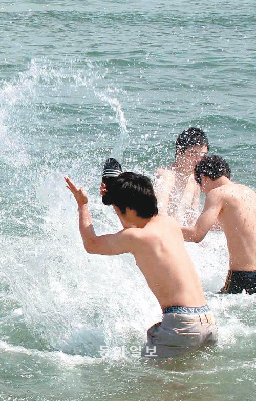 23일 연일 계속되는 초여름 날씨에 부산 해운대해수욕장을 찾은 젊은이들이 물싸움을 하며 더위를 식히고 있다.