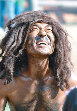 연극배우 정찬교 씨가 지난달 초 경기 연천군 구석기 축제에서 구석기시대 원시인 차림으로 당시 생활을 재현하는 퍼포먼스를 선보이고 있다. 정 씨는 16년간 연천군 전곡읍 선사박물관 선사시대 체험 프로그램과 축제 등에서 공연을 벌여 왔다. 연천군 제공