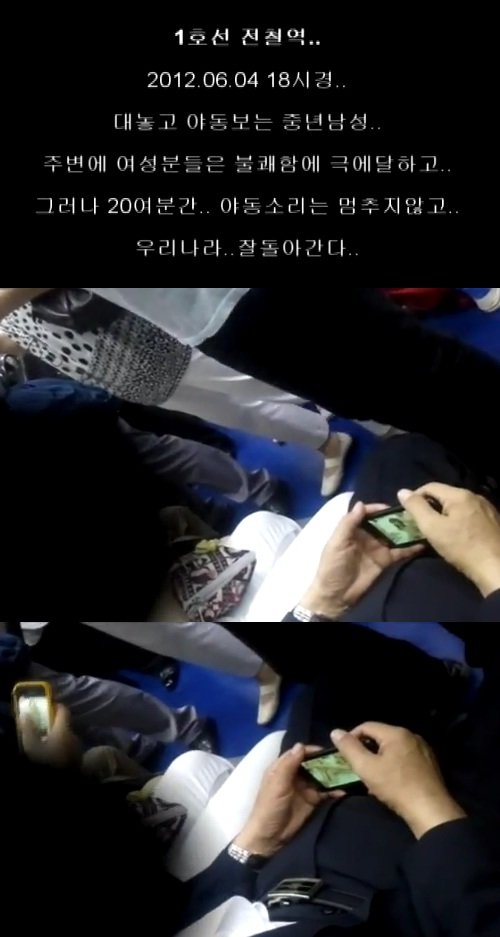 한 남성이 만원인 전철 안에서 자신의 스마트폰을 이용해 ‘야동’(야한 동영상)을 보는 모습이 공개돼 충격을 주고 있다.