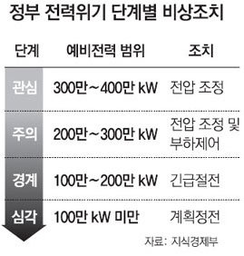 정부는 전력 유관기관에 비상 상황을 전파하는 한편으로 텔레비전 자막 방송을 통해 절전에 동참해 달라고 호소했다. 지경부 관계자는 “현재 추세대로라면 300만 kW 미만의 ‘주의 단계’로 내려갈 가능성은 아직 낮다”고 말했다.