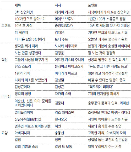 부산발전연구원은 여름 휴가철을 맞아 피서지에서 읽을 만한 책 20권을 뽑아 22일 발표했다. 이 책들은 국립중앙도서관, 부산시민도서관, 교보문고, 영광도서, 삼성경제연구소, 현대경제연구원 등에서 추천한 책을 중심으로 부발연 연구원들이 토론을 통해 선정했다.