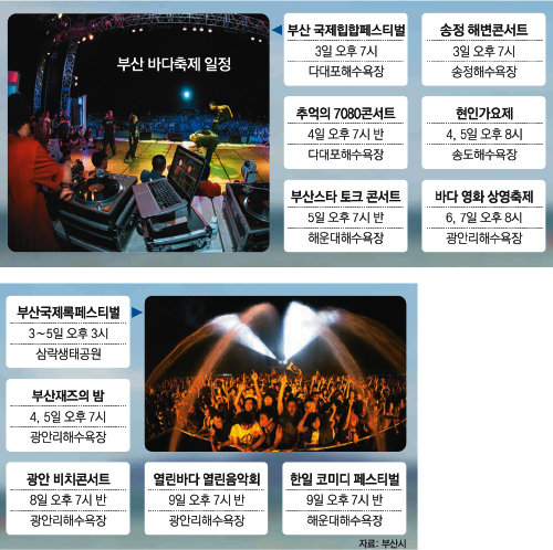 가장 눈길을 끄는 프로그램은 5일 해운대해수욕장 무대에서 열리는 ‘부산 스타 토크콘서트’. 부산 경성대 출신 영화배우 조재현, 경남 김해 출신 개그맨 양상국, 가수 길건, 탤런트 김현숙 이재용 등이 나온다. 9일 해운대해수욕장에서 열리는 ‘한일 코미디페스티벌’에는 부산예술대 출신인 개그맨 허경환의 사회로 꺾기도, 용감한 녀석들, 네 가지 등 KBS 개그 콘서트의 출연자가 출동한다.
