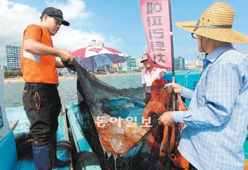 기온이 30도까지 다시 올라간 17일 부산 해운대 해수욕장 앞바다에서 어민들이 통발어선 2척을 이용해 강한 독성을 가진 노무라입깃해파리를 그물로 잡아 올리고 있다.
