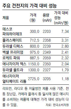 다만 카메라 플래시 같은 고율방전 때는 비싼 제품일수록 성능이 우수한 것으로 드러났다. ‘로케트 파워’(887.5원)는 용량이 400mAh에 그친 반면 ‘에너자이저 얼티메이트 리튬’은 3000mAh에 달했다. 성능 차이가 6.5배나 되는 셈이다. 가격 대비 성능 면에서는 테스코 제품(가격 300원·용량 833mAh)이 가장 우수했지만 용량이 낮아 건전지를 자주 갈아줘야 한다는 점은 단점으로 지적됐다.
