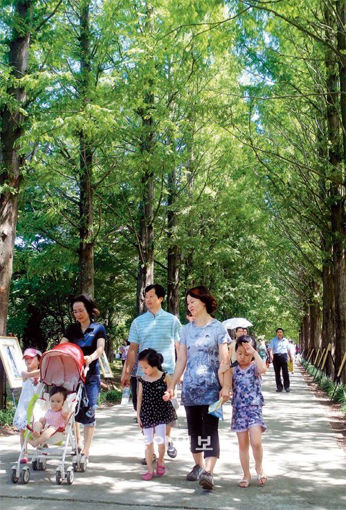 26일 전남 나주의 전남도 산림자원연구소에서 열리고 있는 2012 대한민국 산림박람회를 찾은 관람객들이 메타세쿼이아 숲길을 걸으며 삼림욕을 즐기고 있다. 숲과 산림자원의 중요성을 알려주는 산림박람회는 29일까지 열린다.