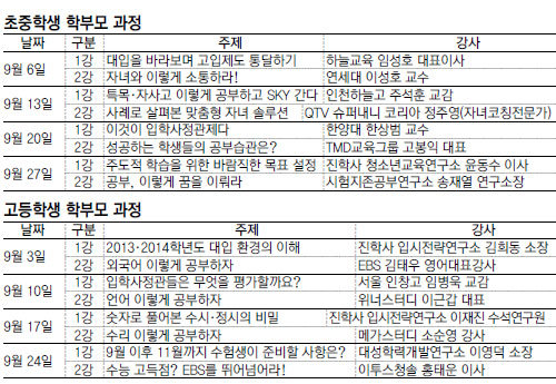 고등학생 학부모 과정에는 당장 코앞으로 다가온 대입에 초점을 맞춘 강의가 집중적으로 진행된다. 올해 대입에서 꼭 알아야 할 변화, 입학사정관전형 등 대입 핵심 정보를 담은 특강과 교육방송(EBS) 공략법, 주요 영역별 공부지도법을 다룬 특강이 각각 매주 1회씩 마련돼 있다.