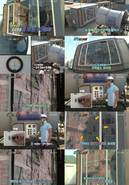 방송에서는 유리창에 테이프를 붙이거나 나무 합판을 대 실험을 했지만 초속 33m 바람에 모두 유리창이 깨지고 말았다.