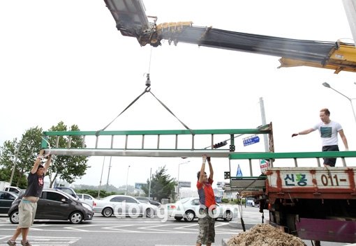 관계자들이 크레인을 이용해 복구작업을 하고 있다.