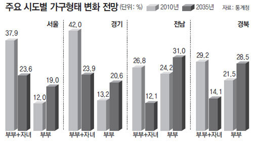 수도권과 지방 사이의 가구구조 격차는 더욱 커질 것으로 예상됐다. 서울의 경우 ‘부부+자녀’ 대 ‘부부’ 가구 비율은 2010년 ‘37.9% 대 12.0%’에서 2035년 ‘23.6% 대 19.0%’로 변할 것으로 예측됐다. 하지만 경북의 경우 2010년 ‘29.2% 대 21.5%’인 비율이 2035년에는 ‘14.1% 대 28.5%’로 구도가 역전돼 부부 둘만 사는 가구가 많아진다.