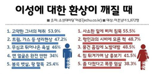 ‘이성에 대한 환상이 산산조각 깨지는 순간’에 남성은 가장 환상이 깨질 때가 ‘체취가 고약할 때’(53.9%)라고 답했다. 이어 ‘생리 현상을 당당하게 보일 때’(47.2%), ‘대화 중 무의식적으로 욕설이 튀어나올 때’(46%), ‘맨 얼굴을 보니 못 알아볼 정도일 때’(34%)도 실망하는 것으로 나타났다.