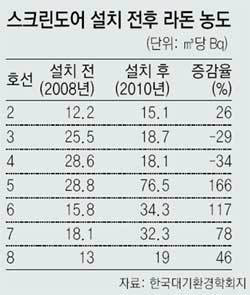 5일 서울시 보건환경연구원에 따르면 스크린도어 설치 전인 2008년 봄 측정한 지하철 2∼8호선 전동차 내 라돈 평균농도는 m³당 20.1Bq(베크렐·방사성 물질의 세기를 나타내는 단위). 하지만 스크린도어 설치가 완료된 2010년 봄 다시 측정한 결과 평균 53%가 증가한 30.8Bq인 것으로 나타났다.