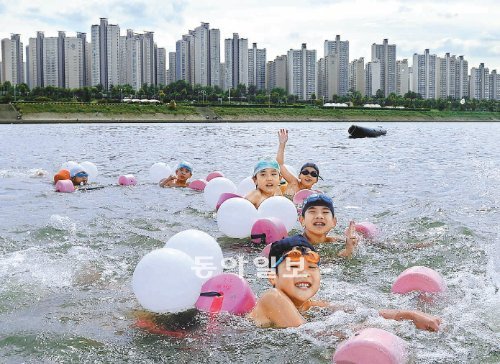 11일 오후 서울 송파구 한강공원 잠실지구에서 열린 ‘서울 어린이 한강 헤엄쳐 건너기’ 행사에 참가한 초등학생이 1km 떨어진 뚝섬지구를 향해 헤엄치고 있다. 이날 행사에는 137개 학교에서 681명이 참가했다.