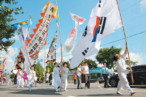 19일 경북 영천시 문외동 영천시청 앞에서 과일축제와 문화예술축제를 알리는 길놀이 행사가 열렸다. 이번 축제는 23일까지 중앙동 강변공원 일대에서 펼쳐진다.