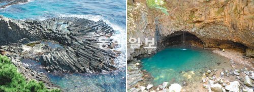 경북 경주시 양남면에 있는 주상절리군(왼쪽 사진)과 경기 포천시 한탄강 유역의 현무암 협곡 및 비둘기낭 폭포가 국가지정문화재인 천연기념물로 지정됐다. 천연기념물 536호로 등재된 양남 주상절리군은 용암이 다양한 방향으로 냉각되면서 생긴 부채꼴 모양의 절리(암석의 결)가 특징이다. 천연기념물 537호인 한탄강 현무암 협곡 및 비둘기낭 폭포는 한탄강 용암대지가 인근에 있는 불무산에서 시작된 강인 불무천에 침식되면서 형성됐다. 비둘기낭 폭포(오른쪽 사진)는 수백 마리의 백비둘기가 폭포 위에 서식한다고 해서 붙은 이름이다.