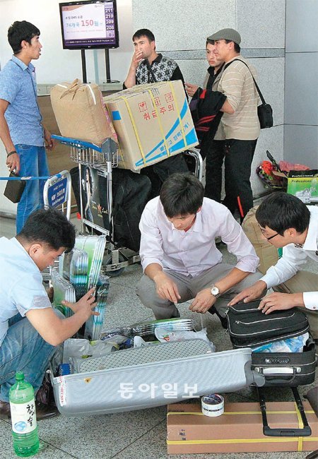 대한항공이 이달부터 국제선 수하물을 승객 1명당 1개(23kg)로 제한한다는 사실을 알지 못한 승객들이 2일 인천국제공항에서 짐의 개수를 줄이기 위해 물품을 옮겨 담고 있다. 인천=김재명 기자 base@donga.com