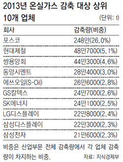 부문별로는 산업(954만 t) 및 발전부문(761만 t) 377개 업체가 줄여야 할 온실가스 비중이 96.3%로 대부분을 차지한다. 특히 산업부문에서는 상위 10개 기업이 감축 목표량의 절반을 채워야 한다. 온실가스를 가장 많이 줄여야 하는 기업은 포스코로 산업부문 할당량의 26%인 248만 t을 줄여야 하며 이어 현대제철, 쌍용양회, 동양시멘트 등의 순이다.