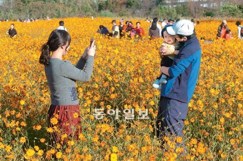 14일 인천 서구 백석동 수도권 매립지에서 열린 드림파크 국화축제를 찾은 가족들이 국화를 배경으로 사진촬영을 하고 있다. 21일까지 열리는 이번 축제에서는 국화 작품 전시 대회 개최 출품작 254점과 코스모스, 국화 대군락의 꽃밭, 화단국, 구절초·들국화 등 다양한 꽃을 감상할 수 있다.