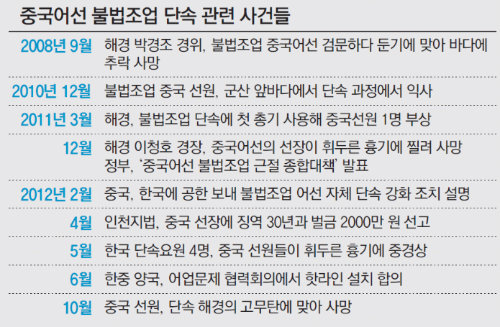 16일 한국 수역에서 불법조업을 하던 중국 선원이 해양경찰의 고무탄에 맞아 숨지면서 한동안 잠잠했던 한중 양국 간 갈등이 다시 불거질 것으로 보인다. 더욱이 이번 사건이 영토분쟁 및 과거사 문제를 놓고 한중일 3국이 외교전쟁을 벌이는 민감한 시기에 벌어져 적지 않은 파장이 있을 것으로 예상된다.