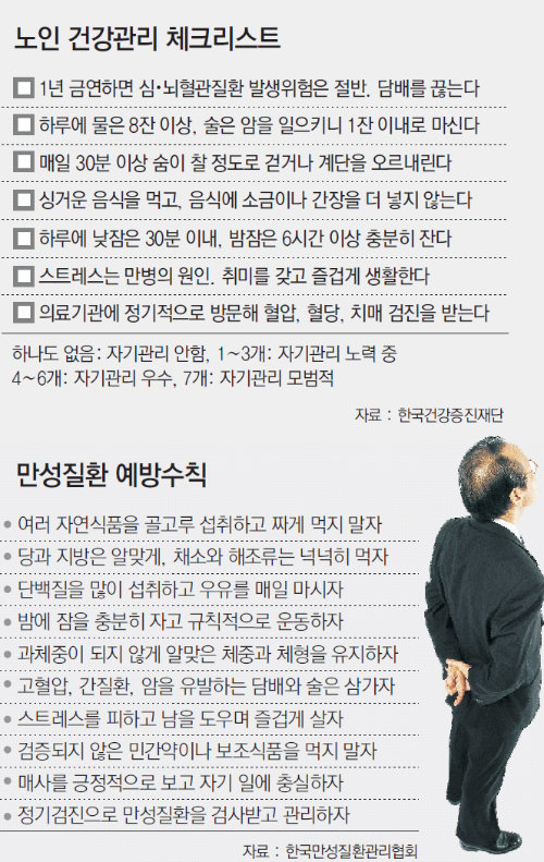 만성질환관리협회는 이를 위해 만성질환 예방수칙을 제정했다. 건강증진재단과 대한영양사협회에 자문해 건강식단도 만들었다. 잘못된 생활습관을 미리 고쳐 노인 질병을 줄이자는 취지다.