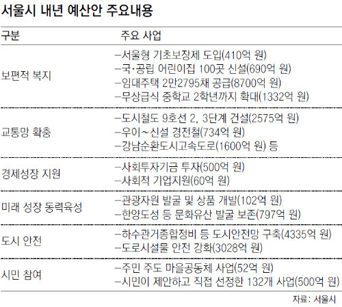 생활수준이 최저생계비 이하이지만 법정 보호를 받지 못하는 비수급 저소득층의 생활보장을 위해 도입하는 ‘서울형 기초보장제’에 410억 원이 책정됐다. 시는 내년 7월부터 최저생계비 60% 이하 비수급 빈곤층 6만 명에게 매달 평균 11만4000원을 지급할 계획이다. 국·공립어린이집을 동별로 2개 이상 설치한다는 목표를 세우고 690억 원을 들여 100곳을 신설하기로 했다.