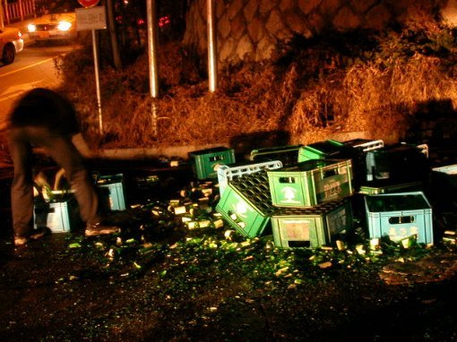 시리즈로 나온 '조금 많이 슬플 사진'은 도로에 소주 박스가 널부러져 있는 모습이다. 소주를 싣고 가던 차량이 운전 미숙으로 사고를 낸 듯 보인다.