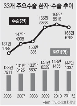 국민건강보험공단이 4일 발표한 ‘2011년 주요 수술 통계’에 따르면 지난해 33개 주요 수술 환자는 144만1337명으로 2010년 148만1435명보다 4만98명(2.7%)이 줄었다. 같은 기간 수술 건수는 168만8516건에서 165만6792건으로 3만1724건(1.9%), 진료비는 3조7653억 원에서 3조7277억 원으로 376억 원(1%) 감소했다. 주요 수술 환자와 수술건수, 진료비가 줄어든 것은 공단이 통계를 집계하기 시작한 2006년 이후 처음이다.