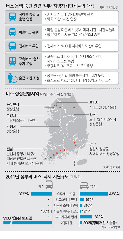 22일 새벽부터 전국 시내·시외버스의 운행이 중단될 위기에 처하자 정부와 각 지방자치단체들은 21일 비상수송대책들을 내놨다.