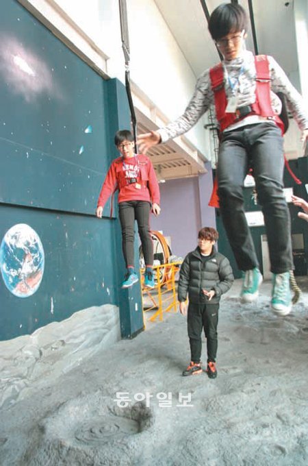 지난달 17일 경북 예천군 예천천문우주센터를 방문한 ‘기자원정대-예천편 1기’ 참가 학생들이 달에서 느낄 수 있는 중력을 체험하는 모습