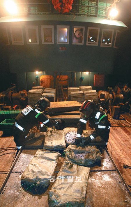 나포된 중국 어선에는 쇠창살뿐만 아니라 삽과 쇠톱, 손도끼 등 무기로 쓸 수 있는 도구도 많았다. 해경은 어선 창고에서 불법으로 잡은 멸치 50t을 압수했다. 최 함장은 “중국 어선들은 주간에는 중국 영해에서 쉬고 있다가 어둠을 틈타 저녁과 새벽 시간에 주로 조업하기 때문에 적발하기가 쉽지 않다”고 말했다.