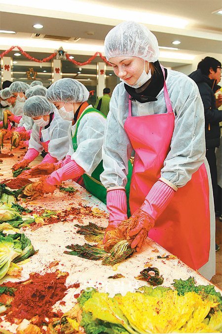 대구대에 유학온 우크라이나 출신 세도빙크 다리아 씨(20)가 6일 교내 생활관 식당에서 김장용 배추에 양념을 버무리고 있다. 대구대는 캠퍼스에서 재배한 배추 1만여 포기 중 9000포기를 사회복지시설에 기증하고 나머지는 김장을 담가 혼자 사는 노인에게 전달했다.