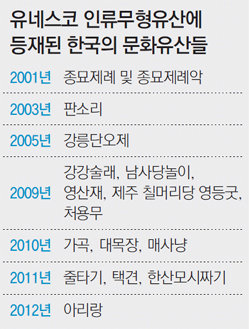 이에 따라 한국은 종묘제례 및 종묘제례악, 판소리, 강릉단오제 등 총 15건의 인류무형유산을 보유하게 됐다. 현재 인류무형유산에는 84개국 213건이 등재되어 있으며 이 가운데 중국이 29건, 일본은 20건을 보유하고 있다. 중국은 지난해 5월 조선족 아리랑을 자국의 무형문화유산으로 지정했으나 한국이 중국보다 먼저 아리랑을 유네스코에 등재함으로써 아리랑이 한국의 유산이라는 사실을 세계적으로 공인받게 됐다.