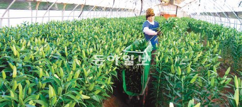 17일 경북 안동시 일직면 화훼농가에서 한 농민이 일본 수출용 백합을 수확하고 있다. 안동시는 올해 11월 말 기준 일본 지역에 수출하는 백합과 국화의 규모가 지난해보다 15배 이상 늘어난 33t을 기록했다고 밝혔다.
