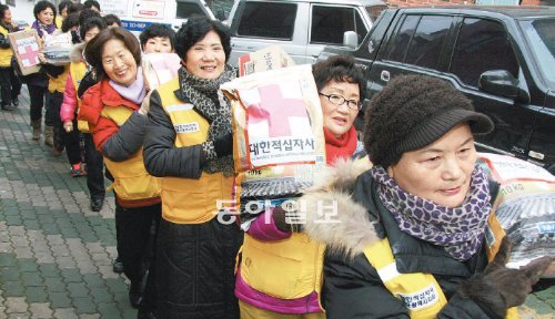 대한적십자 대구지사 자원봉사자들이 대구 중구 남산4동의 홀몸노인들을 위해 쌀을 배달하고 있다. 대한적십자는 20일까지 저소득층 2085가구에 쌀과 라면을 전달했다.