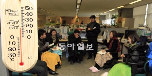 계속된 한파로 전력 수급에 비상이 걸린 21일 오후 서울 강남구 삼성동 한국수력원자력 본사 사무실. 직원들이 덧신, 담요, 장갑, 목도리 등으로 중무장한 채 회의를 하고 있다. 원자력발전소 운영 등을 맡고 있는 한수원은 절전의 모범을 보이기 위해 난방을 전혀 하지 않고 있으며, 이날 사무실의 실내 온도는 15도였다.